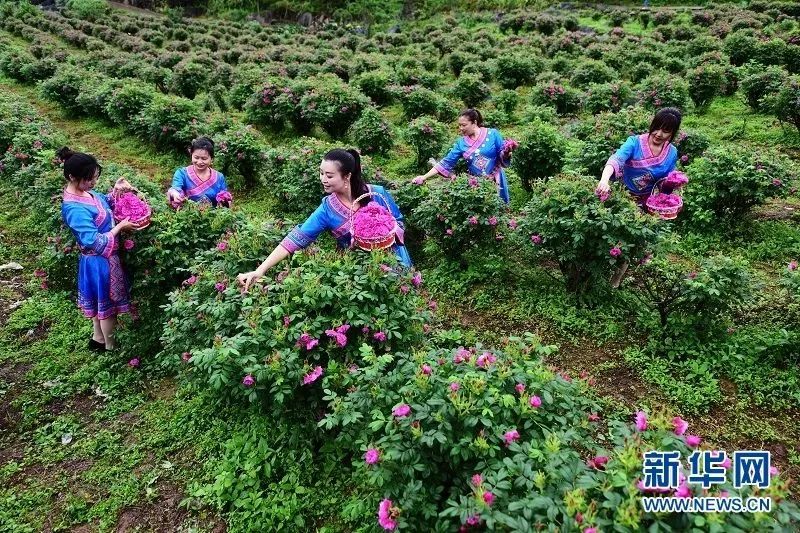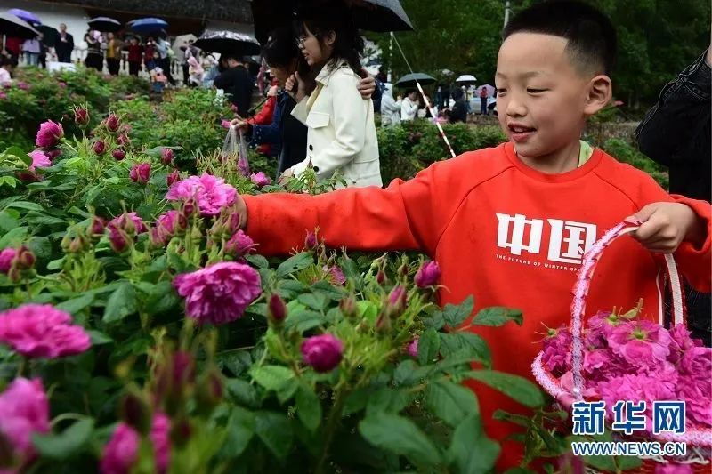 游客在五龍坪村玫瑰花種植基地體驗玫瑰花采摘樂趣