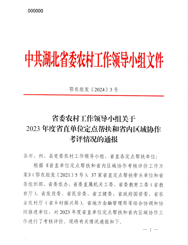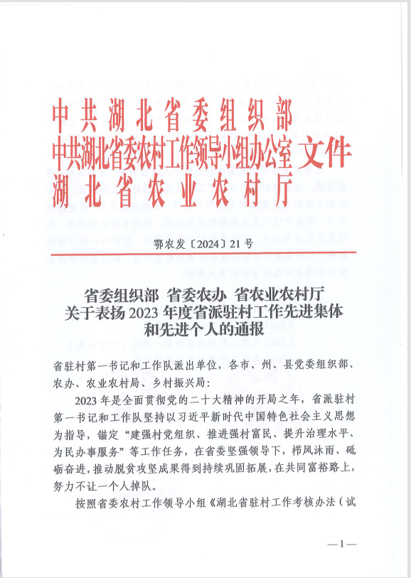 同時,省農(nóng)業(yè)農(nóng)村廳印發(fā)的省委組織部、省委農(nóng)辦、省農(nóng)業(yè)農(nóng)村廳《關(guān)于表揚2023年度省派駐村工作先進集體和先進個人的通報》(鄂農(nóng)發(fā)[2024]21號),湖北清能投資發(fā)展集團有限公司榮獲“2023年度工作突出派出單位”。